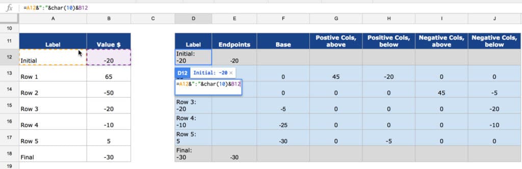 How to Create and Customize a Waterfall Chart in Microsoft Excel Start by selecting your data. You can see below that our data begins with a starting balance, includes incoming and outgoing funds, and wraps up with an ending balance. You should arrange your data similarly. Go to the Insert tab and the Charts section of the ribbon. Click the Waterfall drop-down arrow and pick "Waterfall" as the chart type. Add or remove data labels in a chart - support.microsoft.com Click the data series or chart. To label one data point, after clicking the series, click that data point. In the upper right corner, next to the chart, click Add Chart Element > Data Labels. To change the location, click the arrow, and choose an option. If you want to show your data label inside a text bubble shape, click Data Callout. How To Make Waterfall Charts in Google Sheets Get Your Waterfall Charts Prepared In this step, first, select the entire datasheet and click on the Insert option from the above menu. By doing so, you'll get an option called Chart in the submenu. Now, click on it. Once you've completed the above instruction correctly, a waterfall chart will appear on your Google sheets like the below one. Excel 2016 Waterfall Chart - How to use, advantages and ... - XelPlus To use the new Excel 2016 Waterfall Chart, highlight the data area including the empty cell right above the categories and Insert > Waterfall Chart. It will give you three series: Increase, Decrease and Total. At this point you will see the first two, but not the Total.