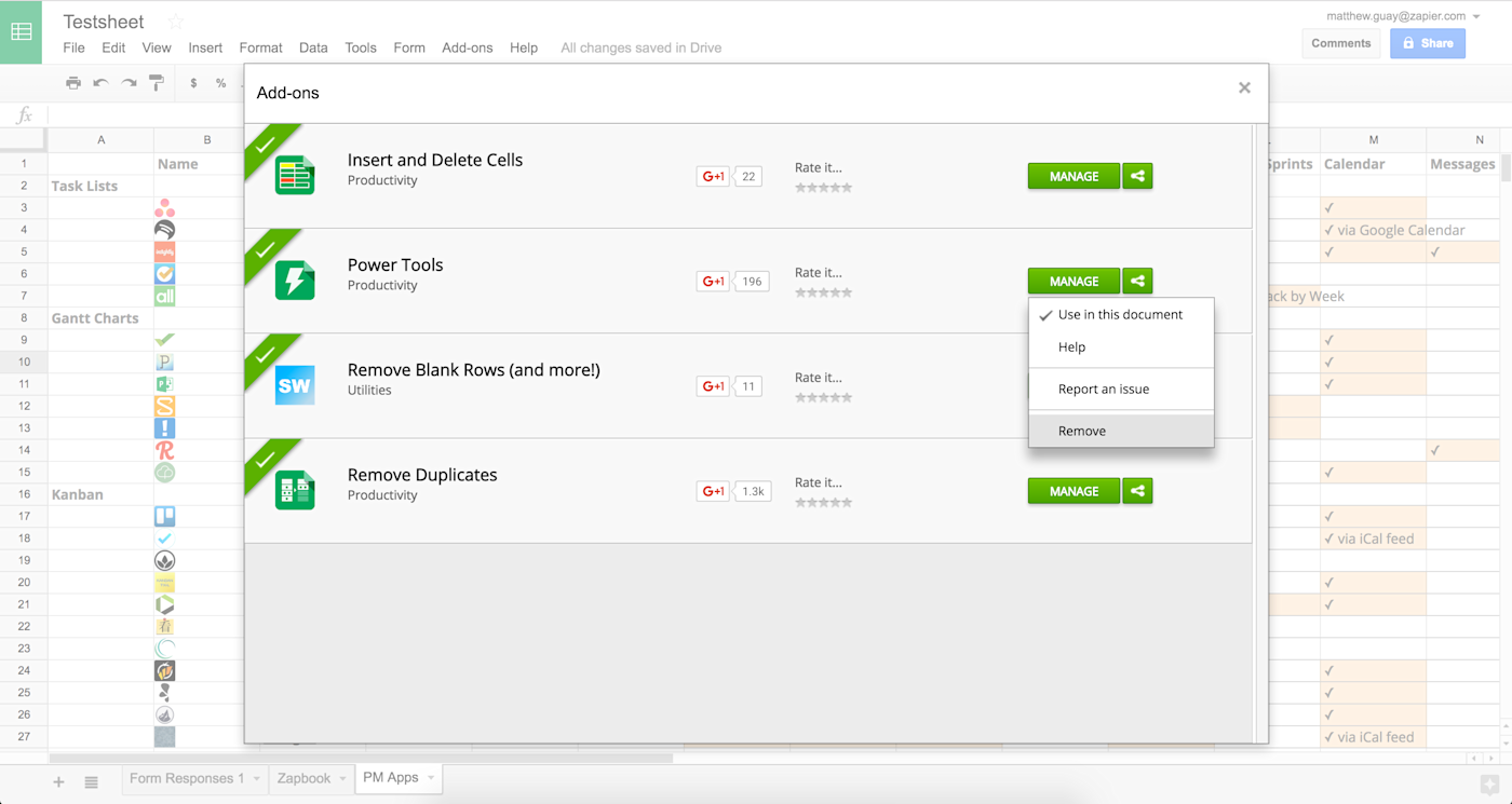 The best Google Sheets add-ons | Zapier Here are some of the add-ons that are built into Power Tools: Merge Sheets to combine data from multiple sheets. Merge Values to merge data in columns, rows, or ranges. Remove Duplicates to remove or mark duplicates from multiple sheets. Split Names to break name parts into multiple columns.